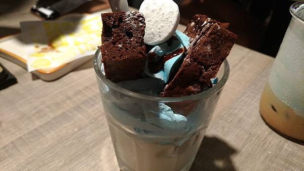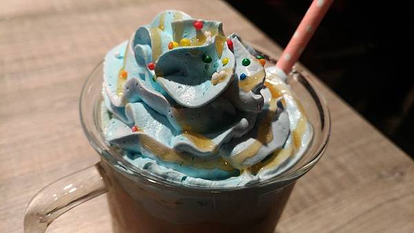 粉藍色鮮奶油給很大方的焦糖瑪奇朵,用燒杯造型的玻璃杯裝